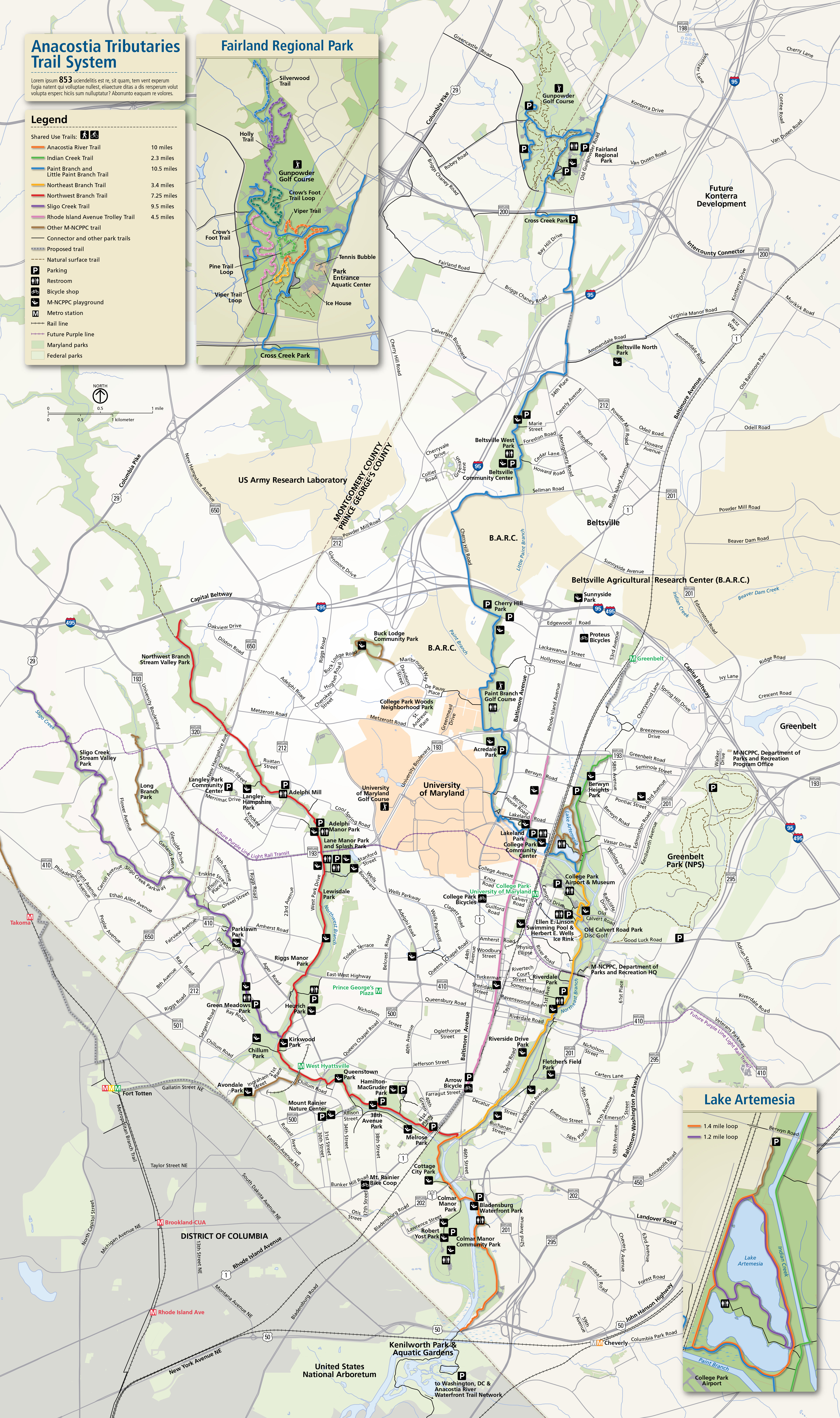 Amenities listed are in parks along the length of the trail.